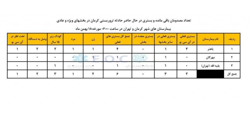 رئیس مرکز فوریتهای پزشکی دانشگاه علوم پزشکی کرمان تصریح کرد: از میان ۶ مصدوم فعلی این انفجار، ۲ نفر زن، ۱ نفر مرد و ۳ کودک زیر ۱۵ سال هستند که در بیمارستان روند درمان خود را طی میکنند.