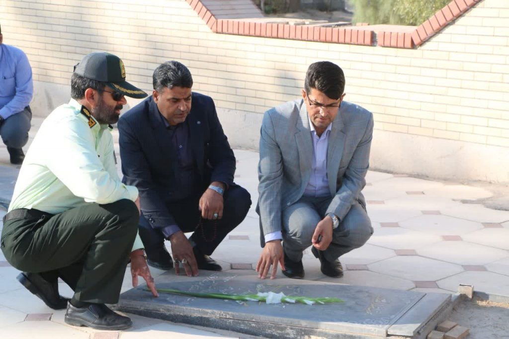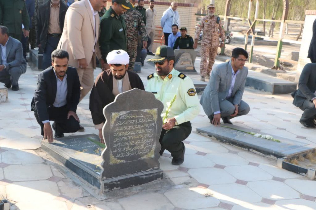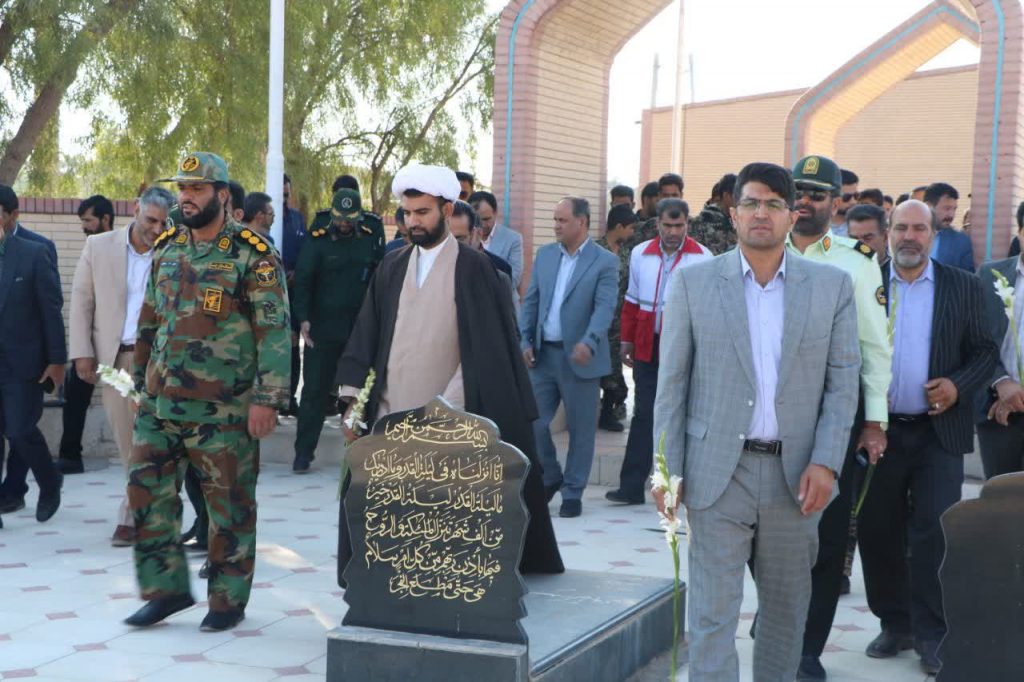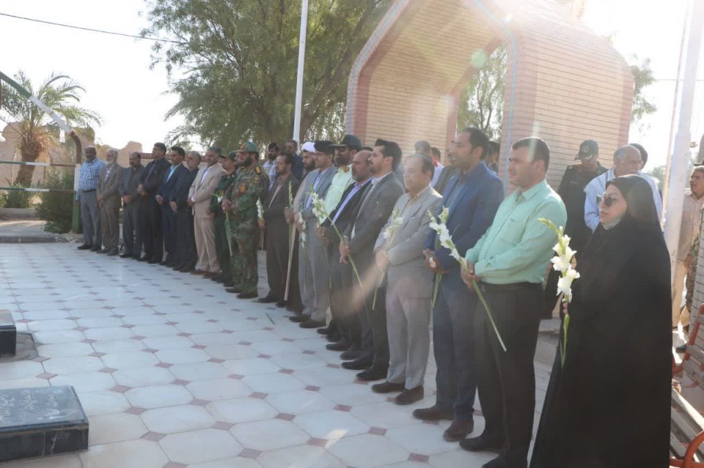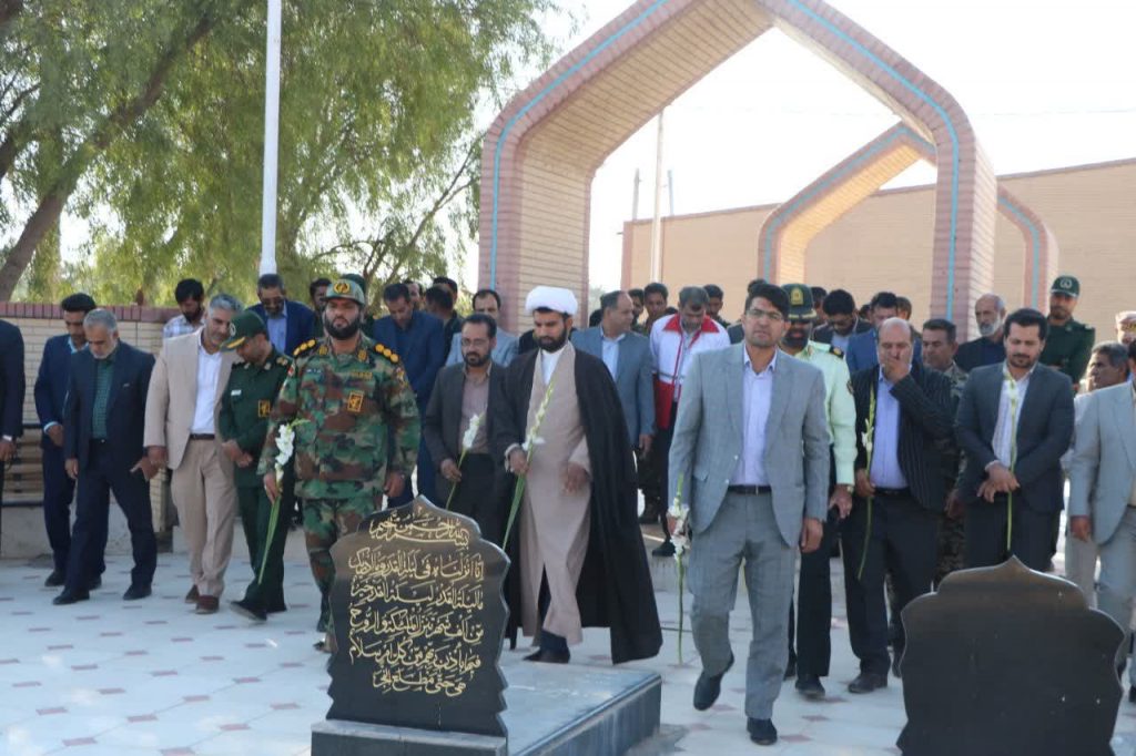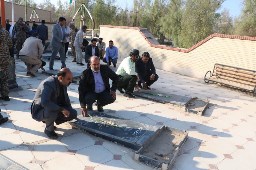 حاضرین در این آیین با نثار فاتحه و اهدای شاخه گل به مقام شامخ شهیدان ادای احترام کردند.